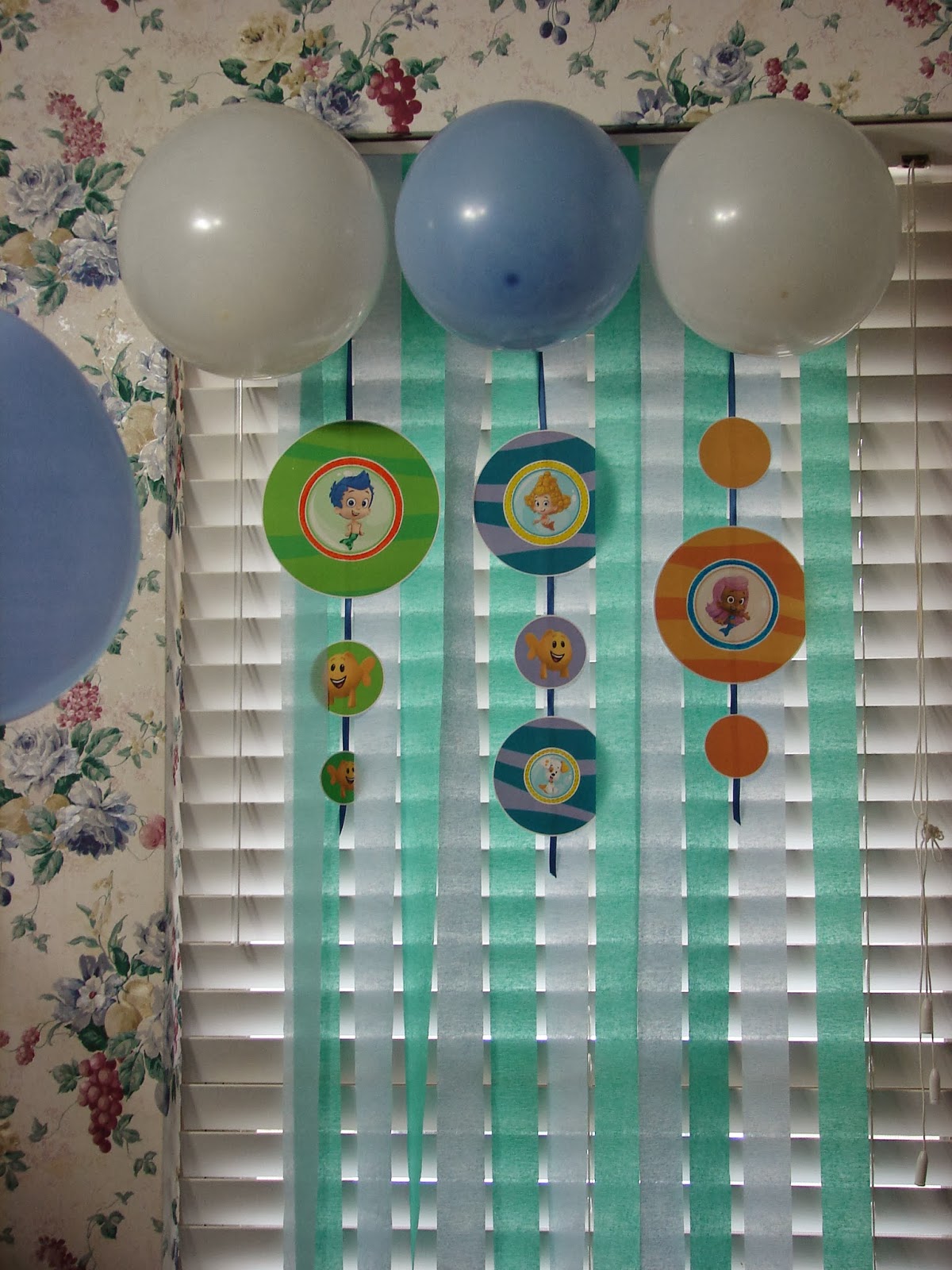 I wanted to create and "undersea" feel with bubbles (actually blue and white balloons) and cool colors. I wanted to incorporate a few different things from the show that I knew Parker would enjoy. I ordered the Bubble Guppies napkins, punch cups and balloons, but everything else I had, bought or made. I had fun making several things for the big day.